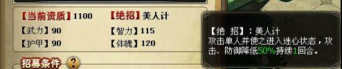 我们接下来看看和张郃相差无几的王元姬。王元姬是五阶弓手,他的四维已经算中上等。那么我们来看看她的绝招,美人计:攻击单人并使之攻击和防御各降低50%一回合。这个技能和张郃的技能差不多,只不过把技能同时作用在敌方单名将领身上,但是实际PK中,攻击敌方单人远远不如攻击敌方一列来的好用。所以推荐指数:3颗星。