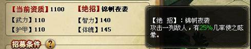 接下来我们来谈论下甘宁。甘宁,吴国之常胜将军,屡立战功。下面我们来看看甘宁的四维,甘宁的四维已经非常高,我们再来看看甘宁的绝招,锦帆夜袭:攻击一列,并25%几率使其眩晕。这个技能非常好用,如果配合弓手自主的被动技能沉默,那么基本上不出眩晕就出沉默,推荐指数:4颗星。