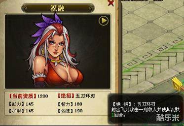 我们再来谈论一个非常好用的将领:祝融。祝融首先是蓝色的六阶将领,其次,他的四维非常之高。那么我们再来看看祝融的技能,五刀环刃:攻击一列敌人并使其沉默1回合。这个技能简直是超好用的技能,攻击一列敌人,外加100%的沉默,而且拥有非常不错的输出。简直是居家必备将领。推荐指数:5颗星。