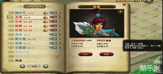等到可以招募第5个将的时候,恭喜你,你的战斗阵容可以变得强大了,加上自己一共5个人,5兄弟,5个福禄娃(貌似还少了两个,呵呵),,这个时候要充分的考虑将领的出阵问题,如果没错的话姜维的招募条件是100绿魂+20蓝魂,这样的条件应当符合了,还犹豫什么,直接招了,RMB玩家累计充值500元的将啊,能不厉害吗,绝技是驱魂(全体雷电攻击,并有50%是对方沉默一回合),很强大的技能~~~~而且长得也蛮帅滴,有图有真相: