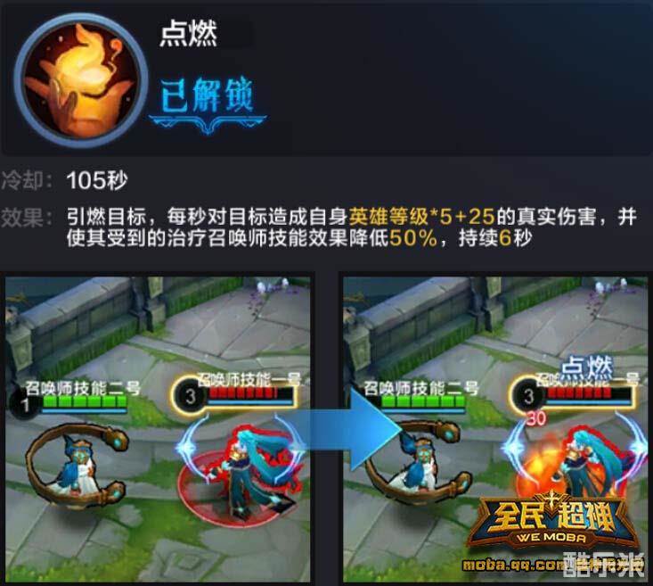 点燃:点燃配合月琴仙自身技能输出,可以帮助她在线上完成击杀,保证自己的线上优势。