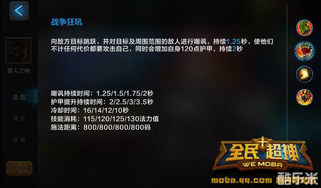 战争狂吼:向敌方目标跳跃,并对目标及周围范围的敌人进行嘲讽,持续1.25秒(满级2秒),使他们不计任何代价都要攻击自己,同时会增加自身120点护甲,持续2秒(满级3. 5秒)