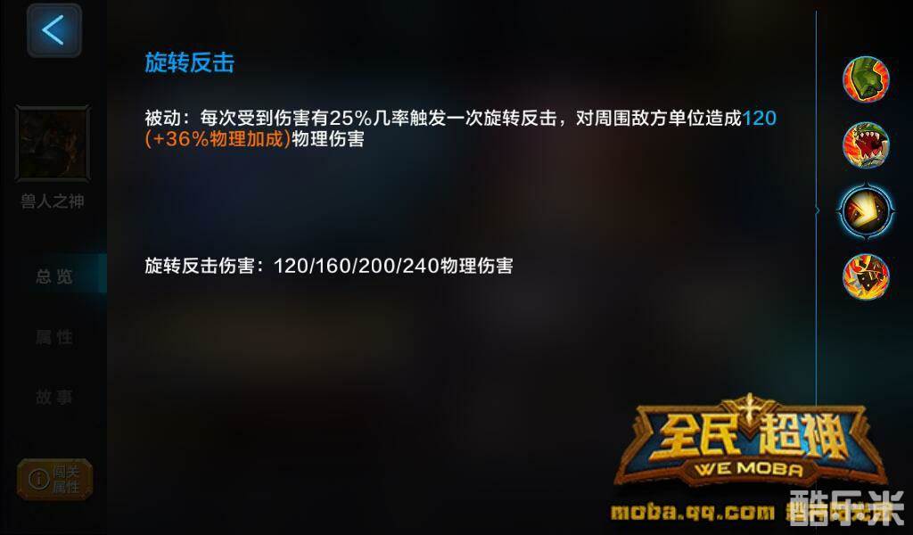 旋转反击:被动 每次受到伤害有25%几率触发一次旋转反击,对周围敌方单位造成120(满级240)(+36%物理加成)物理伤害