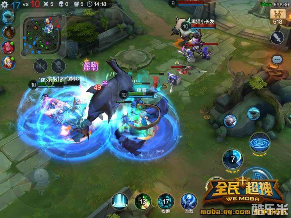 开局以后大家都向敌方奔去,作为一个脆皮奶妈,水天使最好跟在一个输出或者肉盾的后面,先勤奋K兵,提升自己的级别和装备,同时注意看地图上敌我双方的分布,如果有团战需求的时候,第一时间赶过去,到了团战地点,先不要释放大招,观察我方血限,可以先用激流冲击帮助我方英雄晕眩敌方,再用水之赞歌攻击敌方血少的英雄,并且回复己方英雄的生命。当看到我方英雄血限已经有一半掉下去了,此时立刻释放大招——水之守护,就可以瞬间抬起血限,而且还能给我方全部的英雄添加护甲和护盾作用。但是请注意,大招CD太长,不要随便释放,尽量用在关键时刻。作为脆皮的法师,水天使要记住永远不要冲在人前,除非逃跑的时候。逆风局中,当所有的治疗技能都已经释放结束却回天乏术的时候,就应该转头就跑,避免给敌方送人头,毕竟自己血少,腿短,输出低。