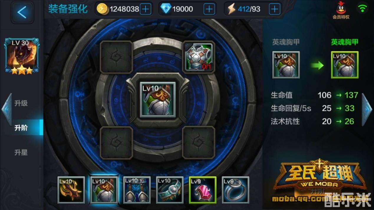 装备升阶主要和英雄升阶有密切关系,不同的是英雄升阶需要的是卷轴,而装备升阶需要的是装备碎片,无双飞将吕布所需要升阶装备使用的材料主要来自闯关掉落,与升级顺序一样,升阶先升级武器,其次项链增加护甲穿透,然后衣服裤子腰带戒指依次升阶,装备阶级越高属性越强。