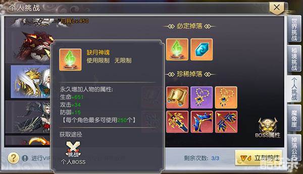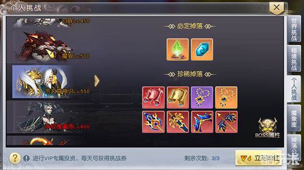 2、个人boss每日共可挑战3次,每次挑战都需消耗挑战券(可通过VIP专属投资获得),挑战券不足的情况下可消耗元宝或绑定元宝进入。挑战次数每日5:00刷新。
