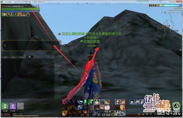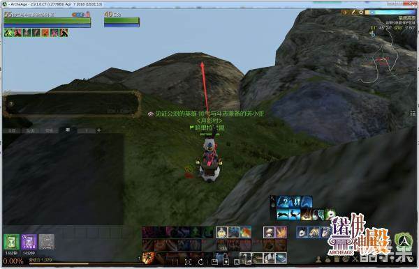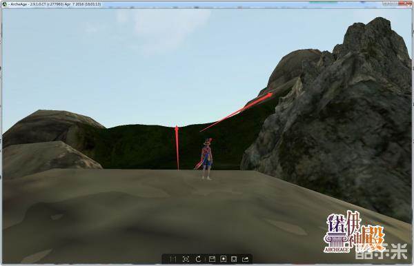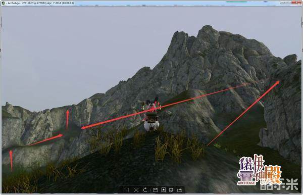 来到左侧山麓下的缓坡上,接下来我们就需要先登上山麓,这样比较好勘察后面的路该怎么走。登山活动除了需要配备一个性能不错的滑翔翼之外,如果有兔子或者兔驼这类比较善于蹦跳越过地形的坐骑那就会更方便了。按照箭头指示的方向骑着坐骑一般就可以直接上去了,当然如果你骑得是只马的话就只能下来使用滑翔翼飞跃起来登上山麓了,马、雪狮这一类的坐骑攀爬方面的能力还是比较差的。