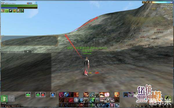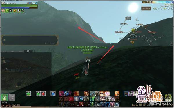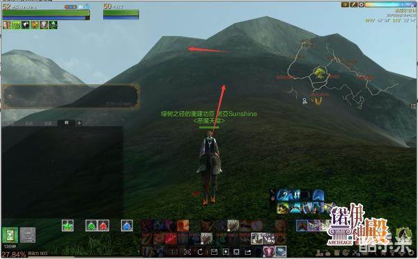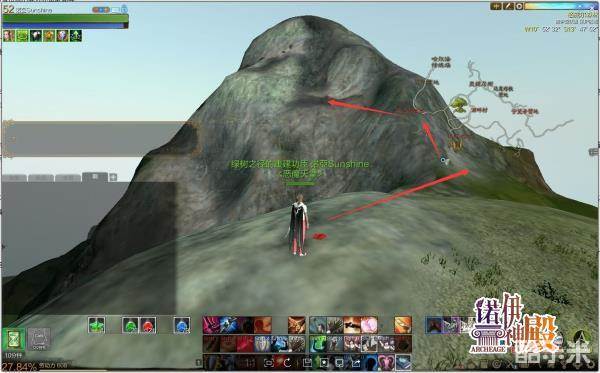 来到如图所示的山坡,按照箭头指示开始向上爬,这座山只是界山的第二高峰,刚开始坡度较缓可以使用马或者兔驼等坐骑,当角度转到左侧山体后坡度开始变陡,我们需要尽量使用加速技能爬到不能再高为止,然后在跳跃瞬间使用滑翔翼跃起,这样就可以来到界山第二峰的中段坡地了。