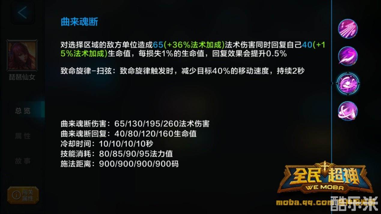曲来魂断:对选择区域的敌方单位造成法术伤害同时治疗自己一定生命值,每损失一定生命值,治疗效果会提升;致命旋律-扫弦:致命旋律触发时,减少目标移动速度。
