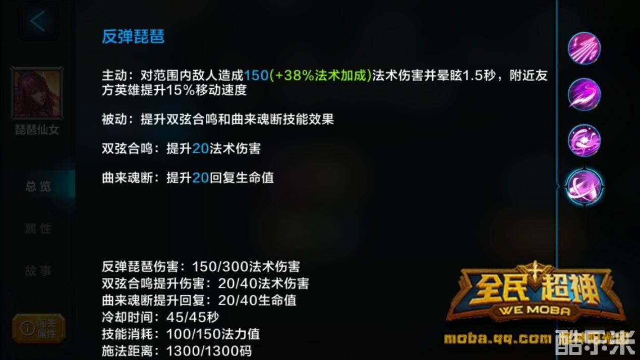 反弹琵琶:晕眩敌人并造成法术伤害,附近友方英雄受到加速效果,提升其他技能效果;双弦合鸣:提升队友普攻附带的额外法术伤害;曲来魂断:提升治疗的生命值。