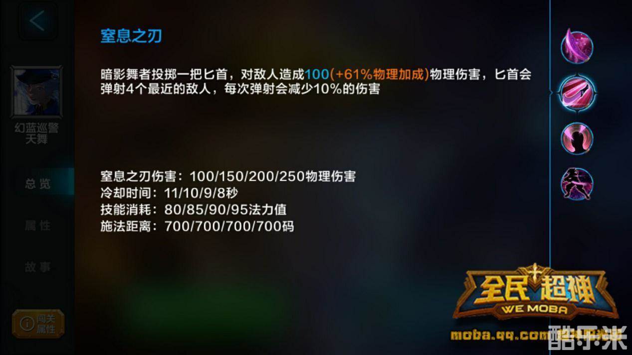 窒息之刃:暗影舞者投掷一把匕首,造成伤害100(+61%物理加成)物理伤害,匕首会弹射4个最近的敌人,每次弹射会减少10%的伤害。