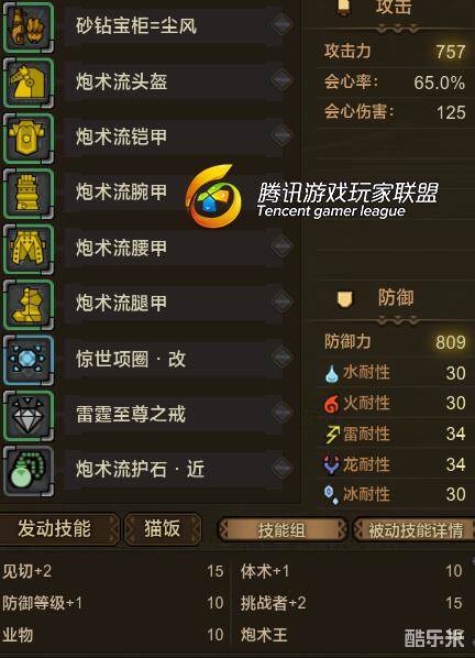 猎装防御力会比较低,目前只能升级到120级,属于新手起步装备,但技能对于铳枪来说是非常全面的,有加炮击伤害,有加防御性能,还有减斩味消耗,再加上挑战者+2和见切+2(炮击伤害固定不会暴击,不享受会心率),既有输出又有防守。