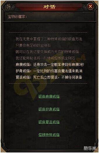 麻痹戒指、复活戒指、戒指,想要获得这些属性逆天的戒指,你需要在开天战神沙漠土城找到特戒兑换NPC。