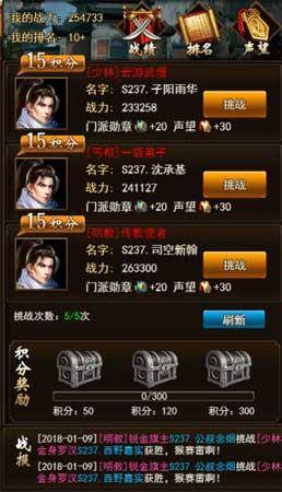 这里就是论剑台的主界面了,在下方可以看见积分奖励的宝箱开启情况。以及上方的可以与之比赛的玩家。