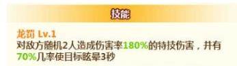 龙罚:对敌方随机2人造成伤害率180%的特技伤害,并有70%几率使目标眩晕3秒。