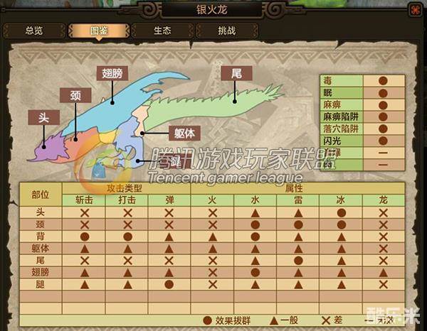 果然够硬!!!头部、颈部、尾巴全武器X而且是近战武器任意斩味弹刀,只有近战基本打不到的背部弱斩击和打击,腿部弱弹击,说明物理武器对于狩猎银火龙,有很大的局限性,属性方面:颈、背、翅膀弱水,颈、尾弱雷,头、颈弱冰,然而颈部同时弱三个属性,但很难命中,不适合做为主要击打部位,经过实战经验得出,尾巴弱雷是银火龙的最大致命伤,雷攻命中后的伤害数值最为可观!!!举例图如下: