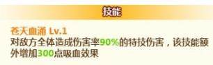 技能:苍天血涌,对敌方全体造成伤害率90%的特技伤害,该技能额外增加300点吸血效果。