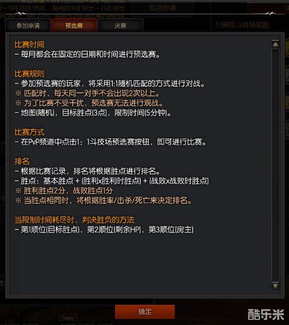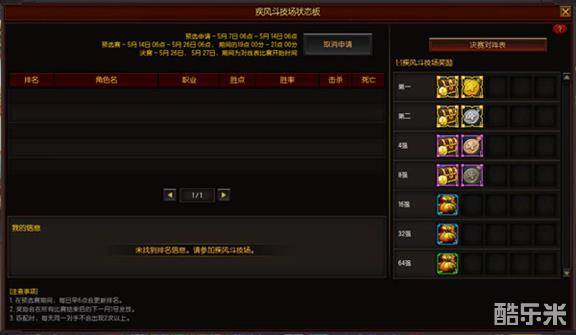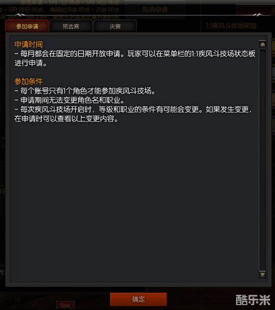 2、疾风斗技场共分为申请、预选赛和决赛,3个阶段。(具体日程可以在每月的1号,点击ESC键,在疾风斗技场状态板进行查看。)