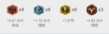 红色法穿配大精华与蓝色雕纹的法强,由于上单普遍是物理近战所以防御符文我们只需要打上黄色护甲即可。如果对手是兰博这样少见的上单AP,那么可以将黄色、蓝色的符文属性互换。