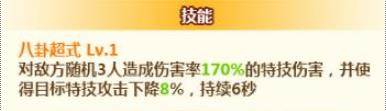技能:八卦超式,对敌方随机三人造成170%的特技伤害。并使得目标特技攻击下降8%。持续6秒。