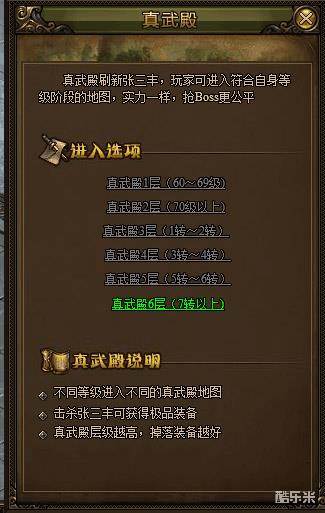 真武殿共分为6层,根据自身的等级、转生等级不同可进入不同的层数。越高层的奖励越丰厚。