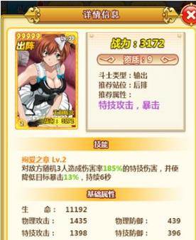 属性解析:后排输出手,吃特技攻击力和暴击。技能殉爱之章对地方随机3人造成伤害率185%的特技伤害,并且降低目标暴击13%持续6秒。