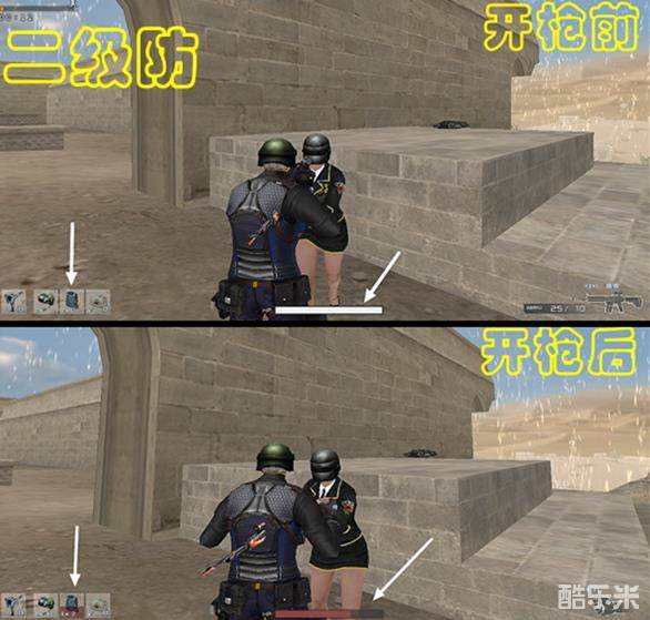 为了更直观的感受一下两个防弹衣的差别,小编换上了一级防弹衣重复上面的测试。开枪前后的变化如上图中所示,我们用这个和二级防的截图对比可以发现,在血量上人物的剩余血量是几乎一致的,但是防弹衣的剩余量,二级防明显剩的更多一些。