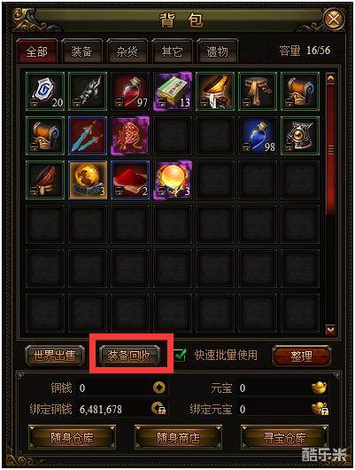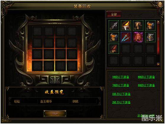 在装备回收中可以将平常打怪掉落的不用的装备进行回收,来换取海量经验和铜钱,回收武器、衣服还可额外获得大量血玉碎片,用来提升血玉的等级。