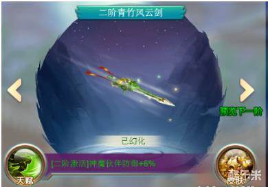 这便是游戏中的飞剑系统,不同阶别外观也不同。不同的阶别还会解锁不同的属性加成。