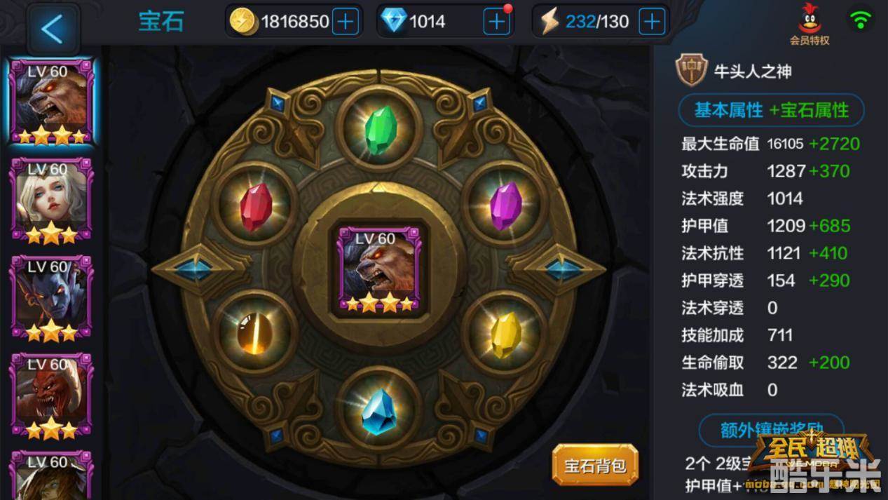 牛头人之神为团队中的前排肉盾英雄,牛头需要突入敌方阵容中控制对方英雄,因此必须增强自己的生存能力,保证突入人群后不会被对方直接集火秒掉。所以首推宝石就是生命宝石,增加牛头的生命值;之后是护甲宝石,增强牛头的护甲以及法抗宝石,增加牛头的魔抗,减少法师对其的威胁。剩下的宝石,可以考虑增强牛头的输出了,搭配攻击宝石及护甲穿透宝石,以及生命偷取宝石,增强牛头的续航能力。