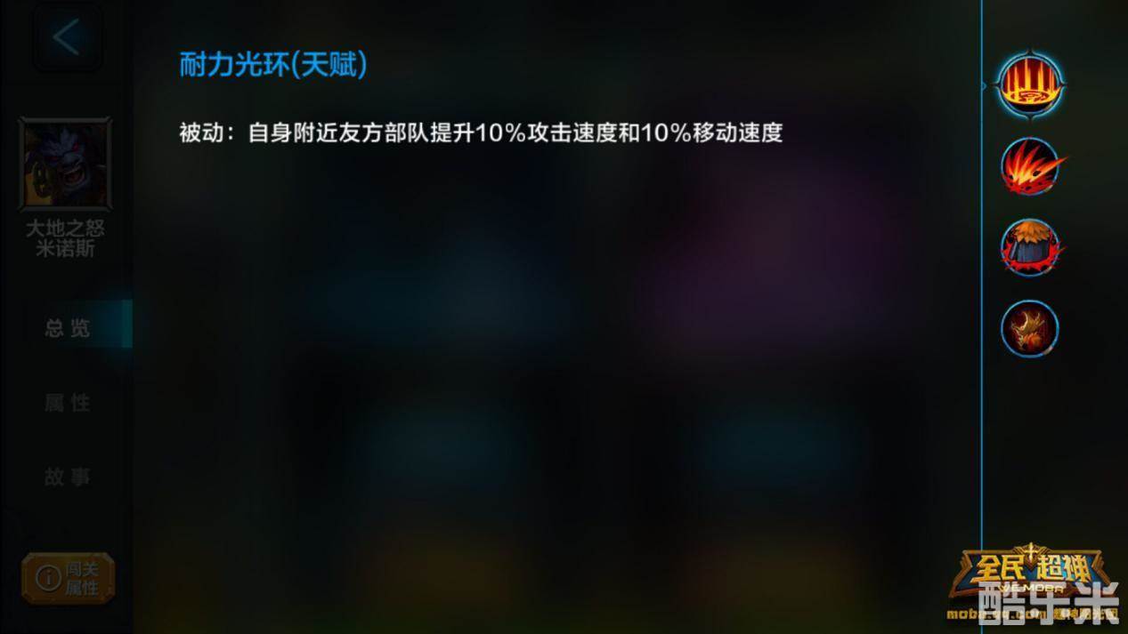 耐力光环(被动):自身附近友方部队提升10%攻击速度和10%移动速度;