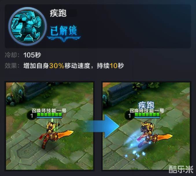 疾跑:疾跑和闪现有异曲同工的效果,唯一的差别就是闪现是定向闪现,必须是特定的方向,而疾跑可以控制方向,无论敌方是怎样的逃跑路线,都可以进行追踪,所以在我看来,闪现是逃跑神技,而疾跑是追踪神技。
