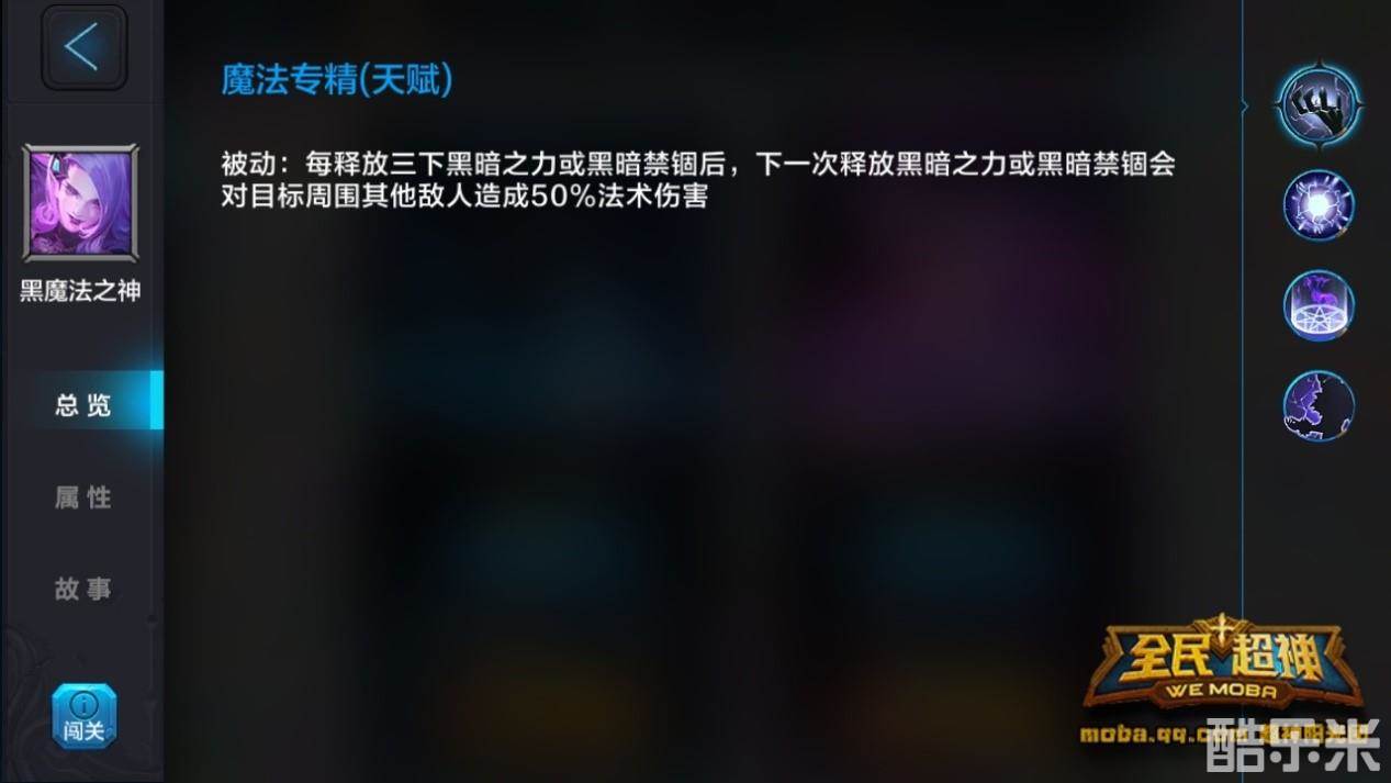 魔法专精:每释放三下黑暗之力或黑暗禁锢后,下一次释放黑暗之力或黑暗禁锢会对目标周围其他敌人造成50%法术伤害。