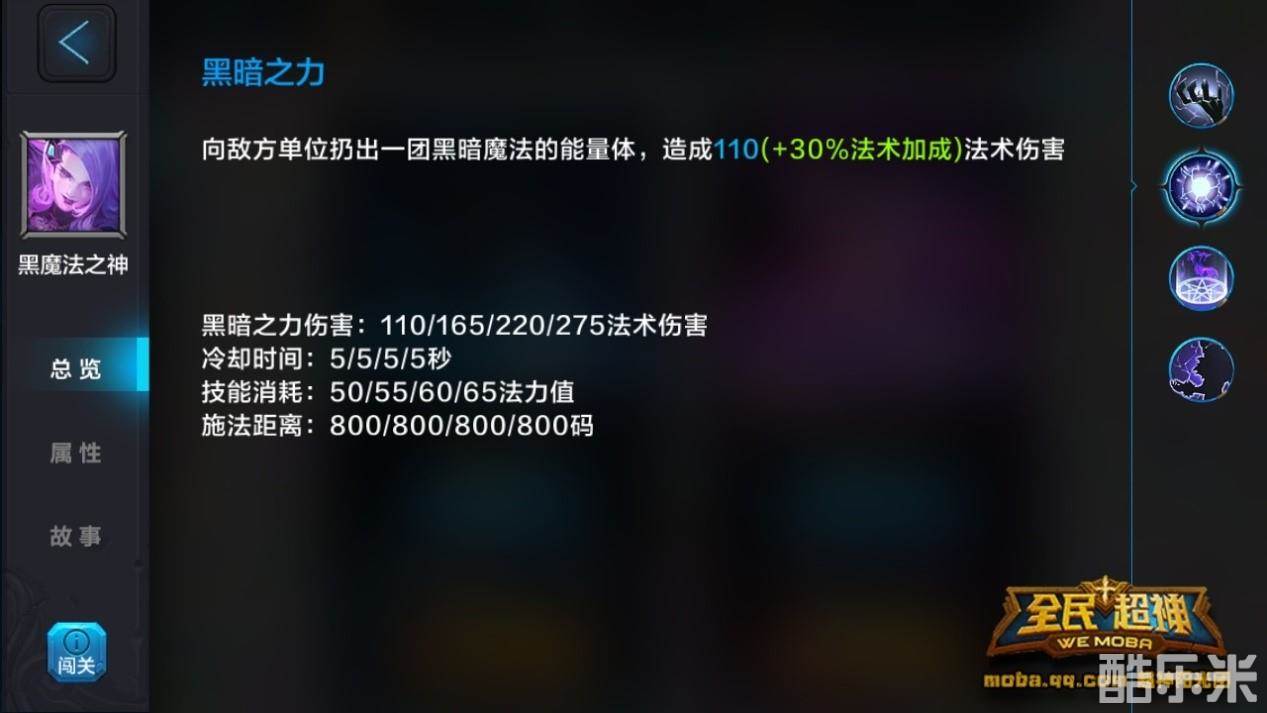 黑暗之力:向敌方单位扔出一团黑暗魔法的能量体,造成110(+30%法术加成)法术伤害。