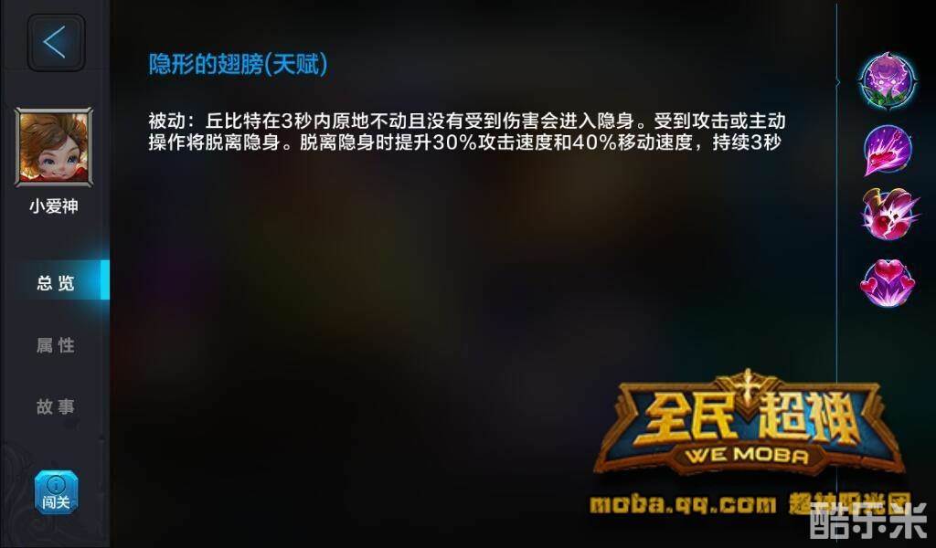 隐形的翅膀:丘比特在原地不动且没有受到伤害会进入隐身。受到攻击或主动操作将脱离隐身。脱离隐身时提升攻击速度和移动速度。