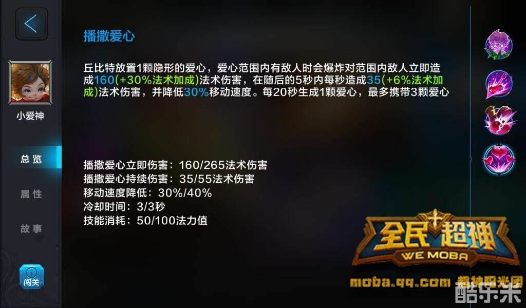 播撒爱心:丘比特放置一颗隐形的爱心,爱心范围内有敌人时会爆炸造成范围法术伤害和减速。爱心需要时间生成,最多携带3个爱心。