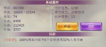 技能:万剑诀,百分百概率对敌方6个目标造成百分之32%的火系伤害。如果可以的话我希望少打几个单位伤害高一点。超大AOE但是伤害难看也是难受。搭配纯AOE阵容剩下精英怪或boss时万分难受,搭配单体爆发阵容又不搭。