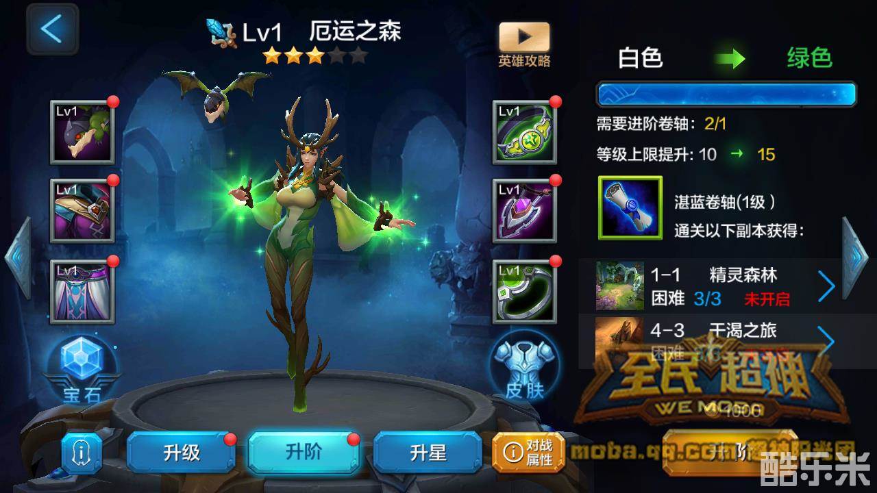 厄运之森进阶需要卷轴,由于厄运之森属于法师,就需要不同等级的湛蓝卷轴。升阶卷轴可以通过刷困难闯关关卡随机获得,或者金币抽奖随机获得,同样商城里也有直接法师升阶的礼包,如果材料不够的小伙伴可以直接到商城购买。