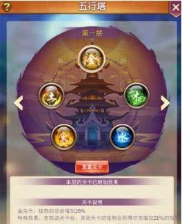 这个就是五行塔的主界面了,每层都有五个关卡,不同的关卡不同的属性。比如金关卡就是所有敌人攻击力增加25%。土属性就是所有敌人防御增加25%。