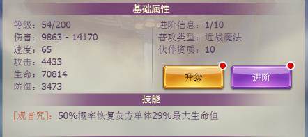 技能:观音咒,50%概率恢复友方单体29%的最大生命值。