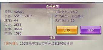 伤害在40级的时候最高可达7100。这就很刺激了,攻击2586一般般,防御1598竟然还不错。作为一个输出位置这样的防算很坦的了吧.