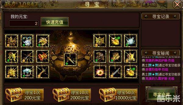 玩家只需花费200元宝便可进行一次寻宝,寻宝池内有大量极品道具,抚国、骠骑、九霄神马的统统都在里面呐!威力提高寻宝几率,玩家也可以选择10/50次寻宝,极品装备不再是梦咯~