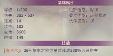 技能御剑术,36%的几率堆敌方单体造成238%的风系伤害。