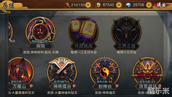 各位道友们,在历练中,我们为大家准备了丰富的玩法,可以从中得到经验、金币、材料、钻石、声望、神将材料、器魂等。还有丰富的竞技体验,单人排位,3V3排位,神将擂台等。