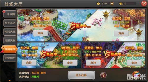 1.战场抽取前一日帮派大战赛前的前6名,相邻的两个名次划分为小战场对战。