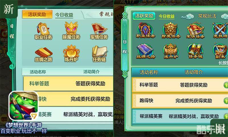 梦想大陆新旧两版UI全面上线梦想大陆,不管是新界面的清新还是旧界面的经典,侠士们均可自行选择喜欢的界面一键切换!新UI画面的颜色更加柔和,画面会更加清楚,字体的颜色与图标的搭配也相得益彰,让侠士们能一下子找到重点信息。不知道侠士们对这样的新UI界面有更多的期待了呢?记得要上线体验一番哦!