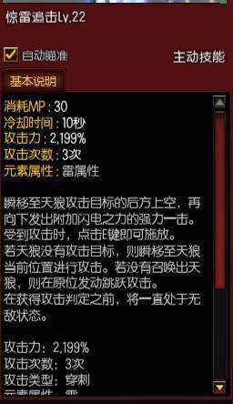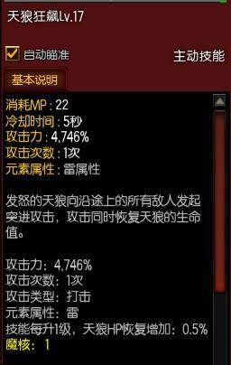 前一次天狼改版后的核心技能,对于一个15级的技能来说,伤害很够看了。唯一不足的是以前要消耗4SP(真踏马贵),然后现在改成3了,恩,点满。AP也看个人喜好吧。AP1加20%总攻击,更适合后期单体怪,优点伤害高,能更好的控制狼的位置,配合惊雷追击打背击效果极好。缺点也很明显,回到身前然后放出激光。对于瞬移的怪,常年易空技能,自身移速攻速太快一不小心不对准怪,也易空技能,以及个人觉得攻击方式略逗比~~AP2加范围,更适合清小怪,以及技能特效更炫酷(也更容易晃队友的眼),所以,看个人喜好吧,这里我自己是前期小怪多的时候点AP2,现在AP1也适应了,所以打输出还是AP1更好点,更新后狼的灵敏度也提高了,以前那种方向不准的情况刷了多次图感