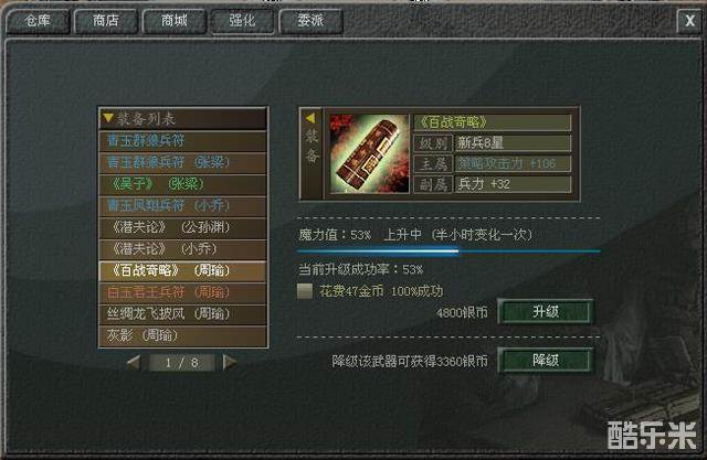 装备每次升级其属性都会进行成长。装备共分为白色,蓝色,绿色,橙色,红色五个品质。品质越高,属性提升的幅度越大。装备升级的成功率由魔力值决定,魔力值每小时变化,尽量选择魔力值高的时候进行升级。