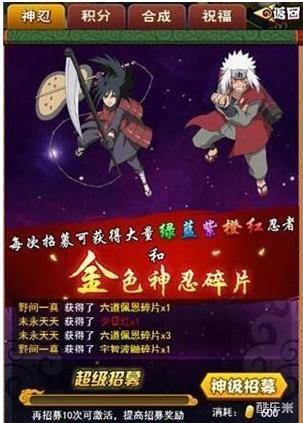 抽取神忍是游戏中忍币的主要用途。玩家每次神级招募需要花费600忍币,获得随机神忍碎片和神忍积分。这里,建议玩家每次累计3000忍币进行5连抽,可以获得50点积分获取当日相对的累计积分奖励,获得额外的神忍碎片。