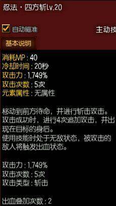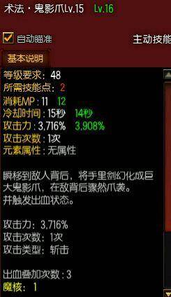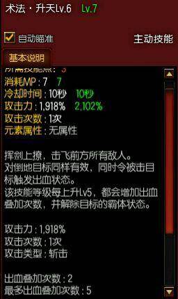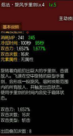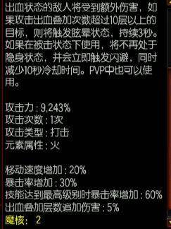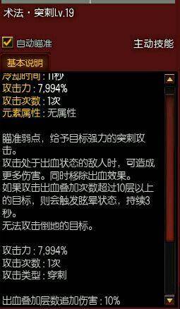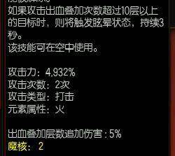 满级7994%的伤害 11S CD 每一层出血追加十分之一的伤害 且出血超过10层时攻击还会眩晕3S